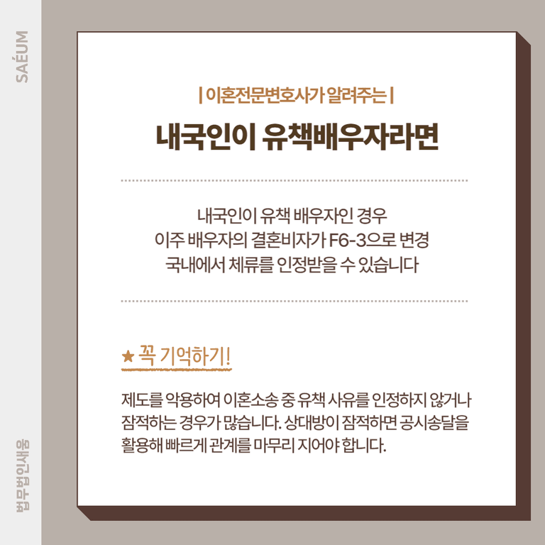 국내 체류를 위해서 결혼하거나 혹은 이렇게 목적으로 접근한 것이 아니어도 이혼하게 되면 이혼 후에도 한국 내에서 머무르고자 하는 사람들이 많습니다. 이때, 내국인이 유책배우자일 경우 결혼비자가 F6-3 비자로 변경이 되어서 국내에서의 체류를 인정해 주게 됩니다. 이는 국내 체류를 위해 가정폭력이나 기타 부당한 대우를 받고도 대처하지 못하는 이들을 보호하기 위해 만들어진 제도인데요. 이 제도를 이용해 비자 유지를 하기 위해 본인이 잘못하여 이혼소송이 진행되고 있음에도 유책 사유를 인정하지 않거나 혹은 아예 이혼소송을 할 수 없도록 잠적하는 일도 있습니다. 이런 문제가 일어나는 것을 막기 위해 이혼 사유를 명확하게 밝힐 필요가 있으며, 상대방이 잠적한다면 공시송달제도를 활용하여 빠르게 관계를 마무리 짓도록 해야 합니다.