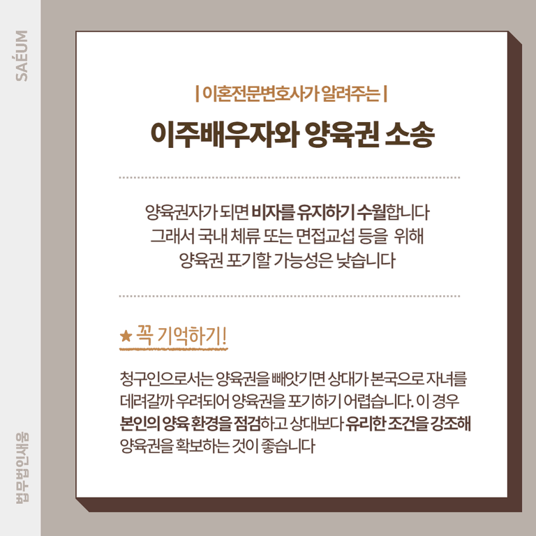 이주배우자가 양육권자가 되는 경우, 자녀의 양육을 위해서라도 비자 유지가 수월해지게 됩니다. 또한 이런 이유가 아니더라도 이주배우자의 경우 비양육권자인 입장에서 비자 유지를 못 하게 되면 현실적으로 주기적인 면접교섭권을 행사할 수 없어지게 됩니다. 그렇기에 자녀와의 유대를 유지하기 위해서라도 양육권을 포기하지 않을 가능성이 높습니다. 청구인으로서는 양육권을 빼앗기면 상대방이 본국으로 자녀를 데려가는 것은 아닐지 우려가 되어 양육권을 포기하기가 어렵습니다. 만일 이렇게 서로 양육자가 되기를 바라는 상황이라면 본인의 양육 환경을 점검하고 상대방에 비해서 유리한 조건을 강조하여 양육권을 확보해 보는 것이 좋습니다.