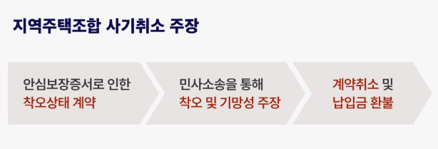 이에 조합원께서는 투자원금을 잃지는 않을 것이다라는 생각에 계약을 체결하고 수천만 원의 분담금을 지급하셨는데, 안타깝게도 부산 송도센텀에서 교부한 안심보장증서는 비법인사단인 지역주택조합의 특성상 조합총회 결의를 통해 작성·교부 되어야 하는데 이러한 절차를 거치지 않고 교부되어 무효에 불과하다는 것이 다수의 법원의 판결입니다. 즉, 전액 환불을 할 수 없음에도 환불이 가능하다는 내용으로 허위의 증서를 교부한 것으로 이는 곧 기망에 해당하기 때문에, 부산 송도센텀 지역주택조합으로부터 해당 문서를 받으신 조합원들께서는 별다른 쟁점이 없는 한 해당 문서를 토대로 민사소송을 제기하여 조합가입 계약 취소 및 분담금 전액 반환을 선고하는 판결을 받으실 수 있습니다. 따라서 만일 부산 송도센텀 지역주택조합을 비롯하여 유사사례로 어려움을 겪고 계시다면 지역주택조합에 경험과 노하우를 지닌 변호사를 통해 법률 상담을 진행해 보시길 권해드립니다.