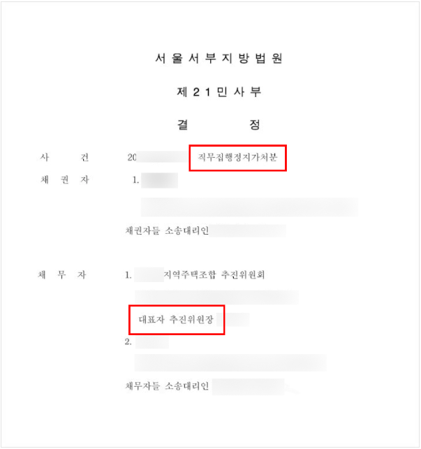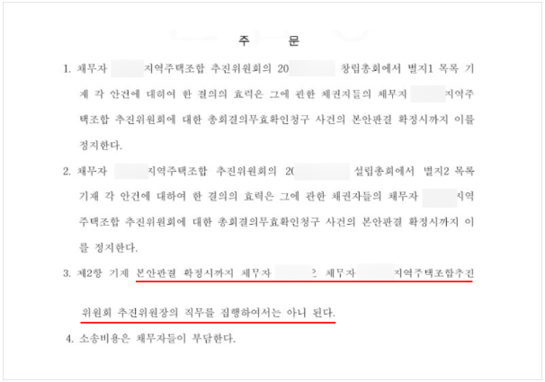 이처럼 직무집행정지 가처분은 조합 임원진의 부조리한 운영이 있을 경우 조합원으로써 행사할 수 있는 법률 대응 방법이기 때문에, 만일 조합의 사업 운영에 문제점이 발견된다면 이를 적절히 활용하여 문제를 해결해야 합니다.