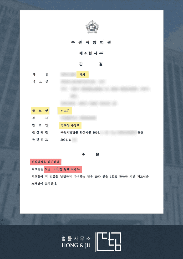 그러면서 징역 6월의 실형을 선고한 원심 판결을 파기하고, 벌금형을 선고했습니다. 이에 교도소에 수감 중이었던 의뢰인은 구속된지 약 2개월만에 석방되어 가족들 품으로 돌아가게 되었습니다.