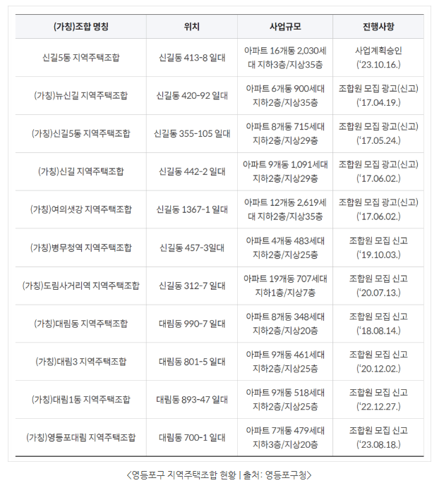 신길5동 지역주택조합, (가칭)뉴신길 지역주택조합, (가칭)신길5동 지역주택조합, (가칭)신길 지역주택조합, (가칭)여의샛강 지역주택조합, (가칭)병무청역 지역주택조합, (가칭)도림사거리역 지역주택조합, (가칭)대림동 지역주택조합, (가칭)대림3 지역주택조합, (가칭)대림1동 지역주택조합, (가칭)영등포대림 지역주택조합