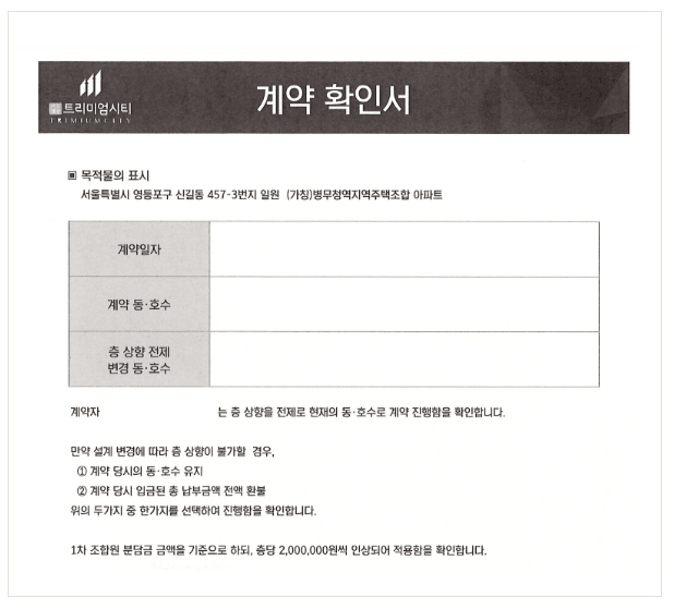 최동욱 변호사의 검토에 따르면, 병무청역 지역주택조합은 계약 당시 조합원들에게 동·호수를 지정하는 내용과 납부금액 전액환불을 약정하는 내용이 담긴 '계약 확인서'를 아래와 같이 교부하였습니다. 그런데 지역주택조합의 재산은 총유물에 해당하므로 전액 환불을 약속하기 위해서는 조합총회의 결의를 거쳐야만 가능하고, 총회결의 없이 위와 같이 환불보장을 약속하는 것은 무효에 불과합니다. 그런데 병무청역 지역주택조합은 조합설립인가 조차 받지 못한 추진위 단계에서, 조합총회의 결의를 거치히 아니하고 마치 납부금액 전액환불이 확정적으로 보장되는 것처럼 계약확인서를 교부하였기 때문에, 이는 처음부터 무효에 불과한 약속(전액환불)을 마치 유효한 것처럼 약속한 기망행위에 해당하므로, 해당 계약 확인서를 교부받으신 분들은 민사소송을 통해 조합계약을 취소하고 납입금을 전액 환불받는 판결을 받으실 가능성이 매우 높습니다.