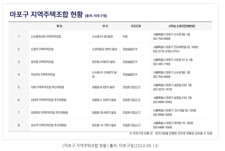 지역주택조합 사업은 아파트 정비사업에 동의하는 사람들끼리 조합을 만든 후 직접 토지를 매입하여 아파트를 건설하는 방식인데, 아파트를 지을 수 있을 정도의 큰 부지를 매입하는 것이 쉽지 않기 때문에 토지매입 단계에서 사업이 막히는 경우가 대부분입니다. 예를 들어 서울시 마포구에는 현재 8개의 지역주택조합이 만들어져 있는데 3개의 조합이 토지소유권 15% 이상을 확보하여 조합설립인가를 받았지만 사업이 그 이후로 계속 정체되어 있어 수년간 사업계획승인을 받지 못하고 있으며, 4개의 조합들은 그 조차도 매입이 이루어지지 않아 추진위원회 단계에 머물러 있습니다.