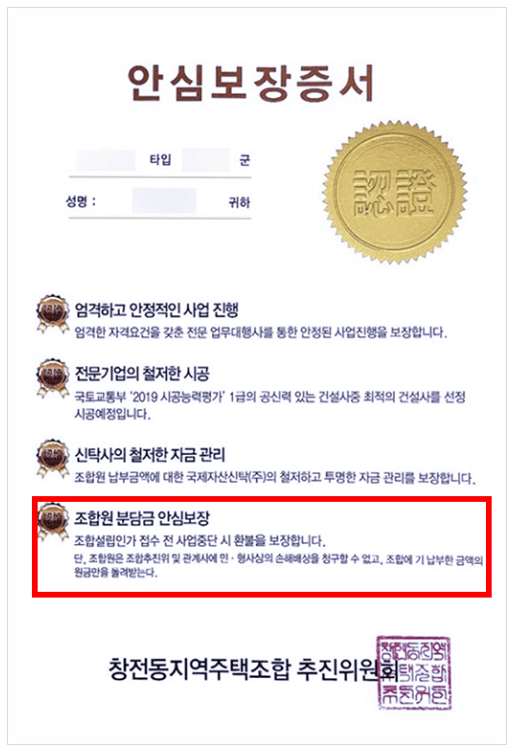 최동욱 변호사의 검토에 따르면 창전동 지역주택조합은 계약 당시 '조합설립인가 접수 전 사업중단 시 환불을 보장합니다.'라고 기재된 안심보장증서를 교부하였습니다. 조합원들은 해당 문서로 인해 창전동 지역주택조합 사업을 안전한 사업이라 생각하고 조합 가입계약을 체결한 것인데, 조합에서 교부하는 이러한 환불보장 약정은 다수의 법원에서 이미 법적으로 실효성이 없다고 판단된 문서입니다. 지역주택조합의 환불보장 약정은 조합의 재산인 총유물을 처분하는 행위에 해당하기 때문에 조합총회의 결의가 필요합니다.