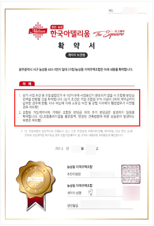 농성동 지역주택조합은 계약 당시 타 지역주택조합들과 마찬가지로 '확약서'라는 이름으로 안심보장증서를 조합원들에게 교부하였고, 해당 문서는 '사업 추진 중 조합설립인가 후 1년이내에 사업승인이 완료되지 않을 시 조합원 분담금 전액을 반환할 것을 확약합니다'라는 내용과 '확정분담금'을 확약하는 내용이 담겨져 있었습니다. 해당 문서는 다수의 법원에서 무효인 것으로 이미 판단한 문서로, 대다수의 지역주택조합들이 이미 안심보장증서로 인해 민사소송에서 패소하였기 때문에 최동욱 변호사는 의뢰인들을 대리하여 해당 확약서의 위법성을 주요 쟁점으로 하여 민사소송을 제기하였습니다.