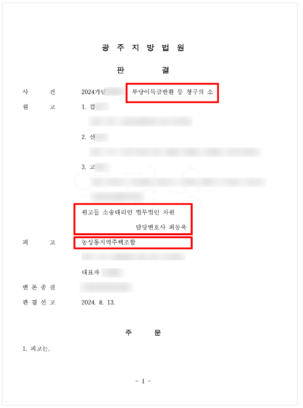 이에 광주지방법원에서는 최동욱 변호사의 주장을 받아들여 아래와 같이 '의뢰인의 조합가입계약을 취소하고, 농성동 지역주택조합은 원고가 납입한 합계 160,810,000원 전액 및 그에 대한 지연이자까지 반환하라'는 내용의 승소판결을 선고하였습니다.