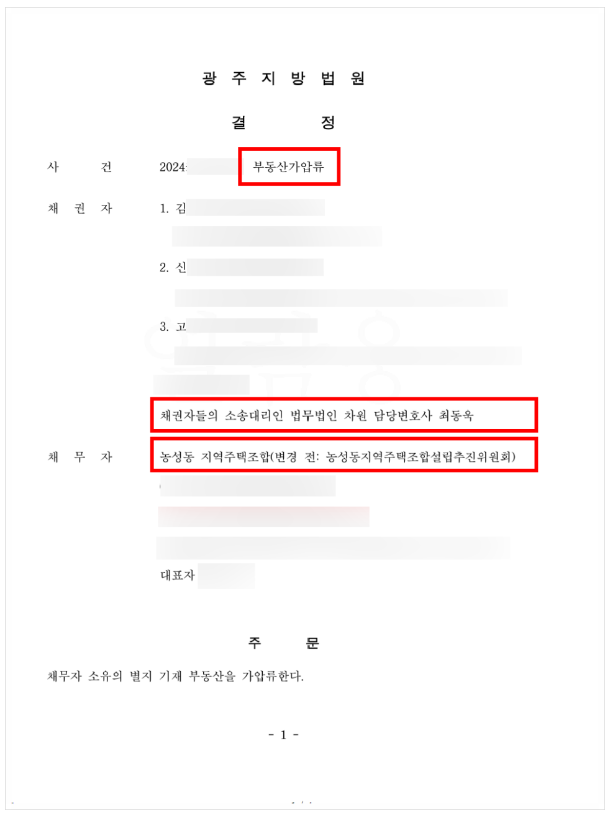 또한 최동욱 변호사는 의뢰인들의 피해금원 회수를 위해 조합이 소유한 부동산을 상대로 가압류를 신청하여 아래와 같이 법원 가압류 결정까지 신속하게 이끌어내어서 의뢰인들은 피해금원 회수에 더욱 가까워지시게 되었습니다.
