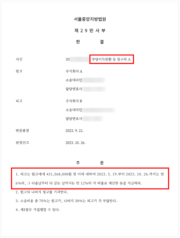 또한 "피고가 이 사건 사업의 사업성 및 리스크를 검토하는 등의 금융상담 및 자문업무를 수행하였다고 주장하나, 해당 자료들은 대부분 원고가 작성하였고 피고의 검토보고서나 의견서 등이 확인되지 않은 점, 그리고 그밖에 다양한 사실관계들을 살펴 보았을 때 피고가 직접 수행한 업무가 거액의 수수료에 비하면 많지 않은 것으로 보인다"고 판단하여, 서울중앙지방법원은 PF 수수료와 중도금 수수료를 당초 약정한 액수의 70%로 감액시키고, 그 결과 피고(금융회사)가 원고(시행사)에게 약 4억 3천만 원 및 그에 대한 지연이자를 반환하라는 승소판결을 선고하였습니다.