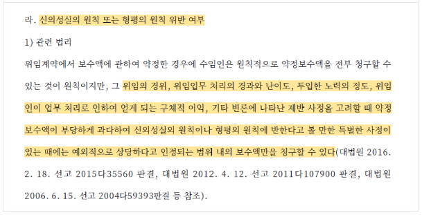 결론부터 먼저 말씀드리자면 법원에서는 앞의 원고의 주장들 중, 피고가 수행한 위임사무의 내용과 난이도에 비해 그 용역대금인 수수료가 부당하게 과다하여 신의성실의 원칙이나 형평의 원칙에 반한다고 판단하여 원고 승소판결을 내렸습니다.