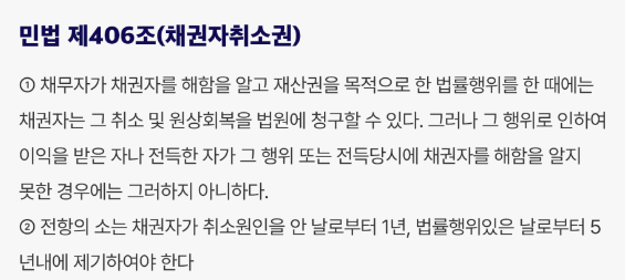 '사해행위'란 채무자가 채권자를 해함을 알면서도 자신의 재산을 은닉 또는 손괴하거나 제3자에 증여하는 등의 방법을 통해 자신의 총재산을 감소시켜 채권자의 강제집행을 어렵게 만드는 행위를 말합니다. 민법에서는 채무자의 이러한 행위로부터 채권자를 보호하기 위하여 아래와 같이 민법 제406조(채권자취소권)을 통해 채무자가 사해행위를 행한 때에 채권자가 그 취소 및 원상회복에 대해 법원에 청구할 수 있다고 명시하고 있습니다. 문제는 채권자의 사해행위최소소송(혹은 채권자취소소송)의 상대방이 채무자 당사자가 아닌 채무자의 재산을 넘겨받아 해당 재산의 소유권·명의를 가지고 있는 수익자나 수익자로부터 재산을 받은 전득자가 되기 때문에, 간혹 매도인이 채무초과상태에 있었는지를 전혀 모르고 부동산을 매수하였던 매수인이 매도인의 채권자로부터 갑작스럽게 소송을 당하는 경우가 발생할 수 있습니다.