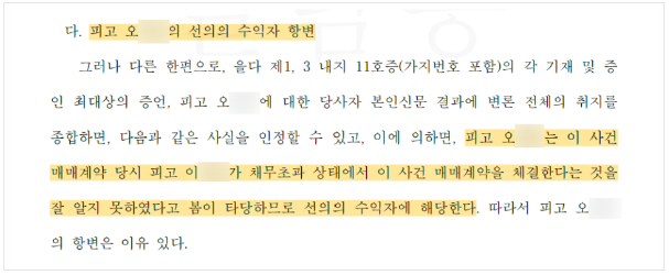 최동욱 변호사는 피고인 의뢰인을 대리하여 '피고는 매매계약 당시 채무자 이00이 채무 초과 상태에서 계약을 체결한다는 것을 잘 알지 못하였다'는 선의의 수익자 항변을 하였습니다. 또한 부동산 중개인에 대한 증인신문 및 당사자 본인 신분 등을 진행해 이를 입증하며, 피고는 중개인이 한 인터넷 광고를 통해 부동산을 소개받아 계약을 체결하였고, 이 사건 매매계약 이전까지 채무자와 전혀 알지 못한 사이였다는 점 등을 구체적으로 입증·주장하였습니다.