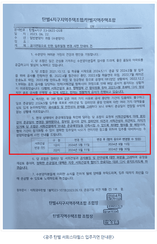 전국적으로 입주지연으로 인한 수분양자들의 피해사례가 지속되고 있어 많은 분들의 법률 상담 문의가 이어지고 있습니다. 특히 오랜 기간 입주지연으로 인해 갈등을 빚어온 경기 광주 탄벌 서희스타힐스의 입주지연이 계속해서 해결되지 않고 있어 수분양자들의 법적인 대응책 마련이 시급한 실정입니다.