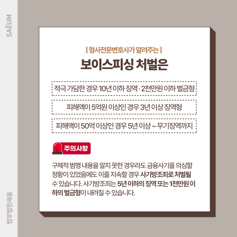 쉽게 많은 돈을 버는 방법은 없으며, 고수익에는 그만한 대가나 위험이 따릅니다. 이것은 누구나 알고 있는 사실이지만, 혹시나 하는 마음에 고수익 단기 아르바이트에 지원하는 분들이 많습니다. 가볍게 용돈벌이 혹은 급하게 생활비를 충당하기 위해 시작한 아르바이트로 인해 보이스피싱에 연루되어 처벌을 받을 수 있습니다. 심지어 돈을 벌기 위해 시작한 일로 경제적 손실까지 입게 될 수 있습니다. 감형 및 선처를 받기 위해 피해자와 합의를 하는 과정에서 합의금으로 범행 수익 이상의 손실이 생길 수 있습니다.