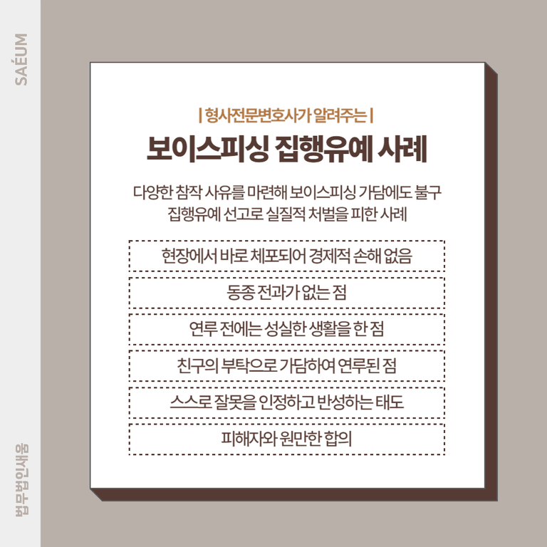법무법인 새움의 형사전문변호사는 위기에 처한 A씨가 집행유예를 받을 수 있도록 참작 사유를 마련하여 선처를 유도했습니다. A씨는 현장에서 바로 체포되었기 때문에 실질적으로 경제적 손해를 입히지 않았다는 점을 강조했습니다. 또한 동종전과가 없으며, 보이스피싱에 가담하기 전에는 성실히 일하고 건전한 생활을 했고, 친구의 부탁으로 가담한 점을 활용하여 선처를 호소했습니다. 무엇보다 A씨가 스스로 잘못을 인정하고 반성하고 있으며 피해자와 원만한 합의를 이루었다는 점, 주변인의 탄원서를 통해 사회적 유대가 뚜렷하다는 점을 강조했습니다. 형사전문변호사가 적극적으로 대응한 결과 금융사기에 깊이 연루되었음에도 불구하고 집행유예로 사건이 마무리되었고, 실질적인 처벌을 피할 수 있었습니다.