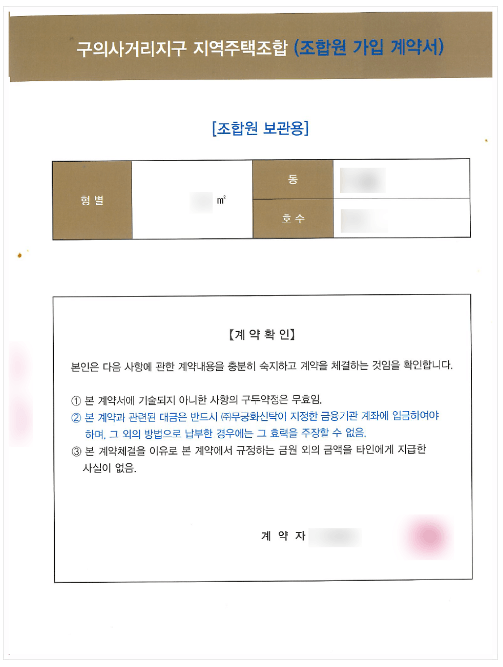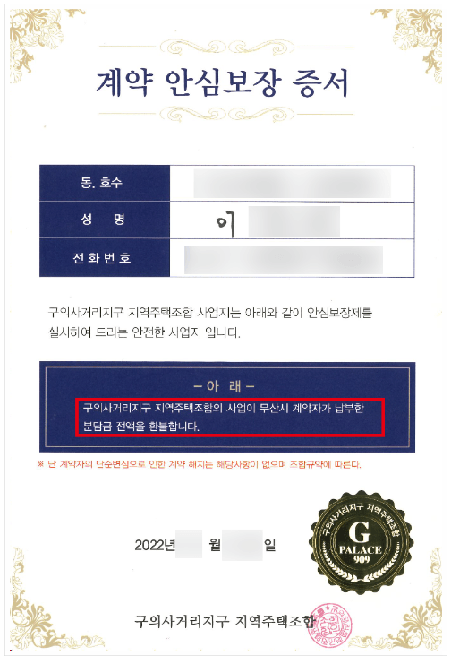 의뢰인은 조합가입계약 체결 당시 아파트 모델하우스에서 상담을 받았는데, 당시 상담원은 의뢰인에게 "구의사거리지구 지역주택조합의 사업이 무산시 계약자가 납부한 분담금 전액을 환불합니다"라고 기재되어 있는 계약안심보장증서를 교부할 것이니 안심하고 계약을 체결해도 좋다고 설명하였습니다. 이에 사업이 망하더라도 원금을 지킬 수 있다고 생각한 의뢰인은 조합가입계약을 체결하고 계약금 및 분담금을 지급하셨습니다.