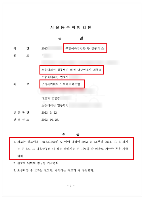 소송을 위임받은 최동욱 변호사는 조합에서 교부한 계약안심보장증서를 비롯한 조합측의 여러가지 위법사항을 입증·주장하였고, 이에 서울동부지방법원에서는 아래와 같이 1심에 이어 2심까지 구의사거리지구 지역주택조합으로 하여금 의뢰인에게 1억 5,833만원 전액을 반환하라는 전액 승소판결을 선고하였습니다.