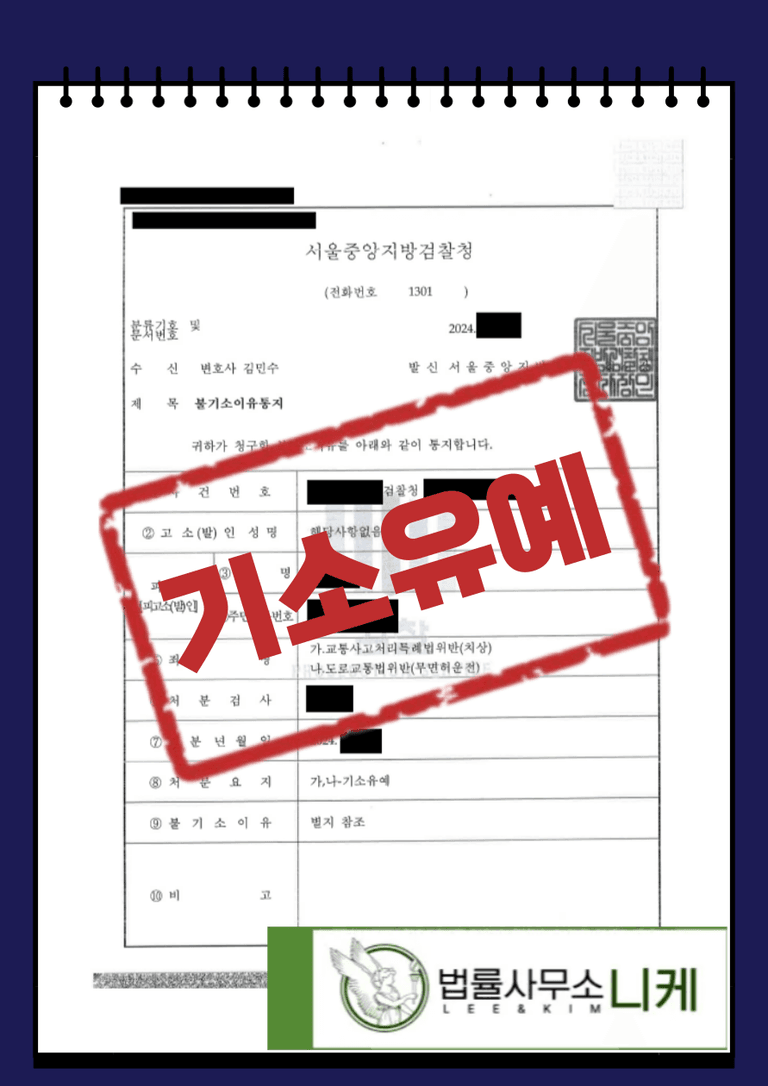 그 결과 의뢰인은 교통사고처리특례법위반(치상) 및 도로교통법위반(무면허운전) 혐의를 받고 법정형으로 최대 징역형을 선고받을 수 있었음에도 불구하고 기소유예 처분을 받을 수 있었습니다.