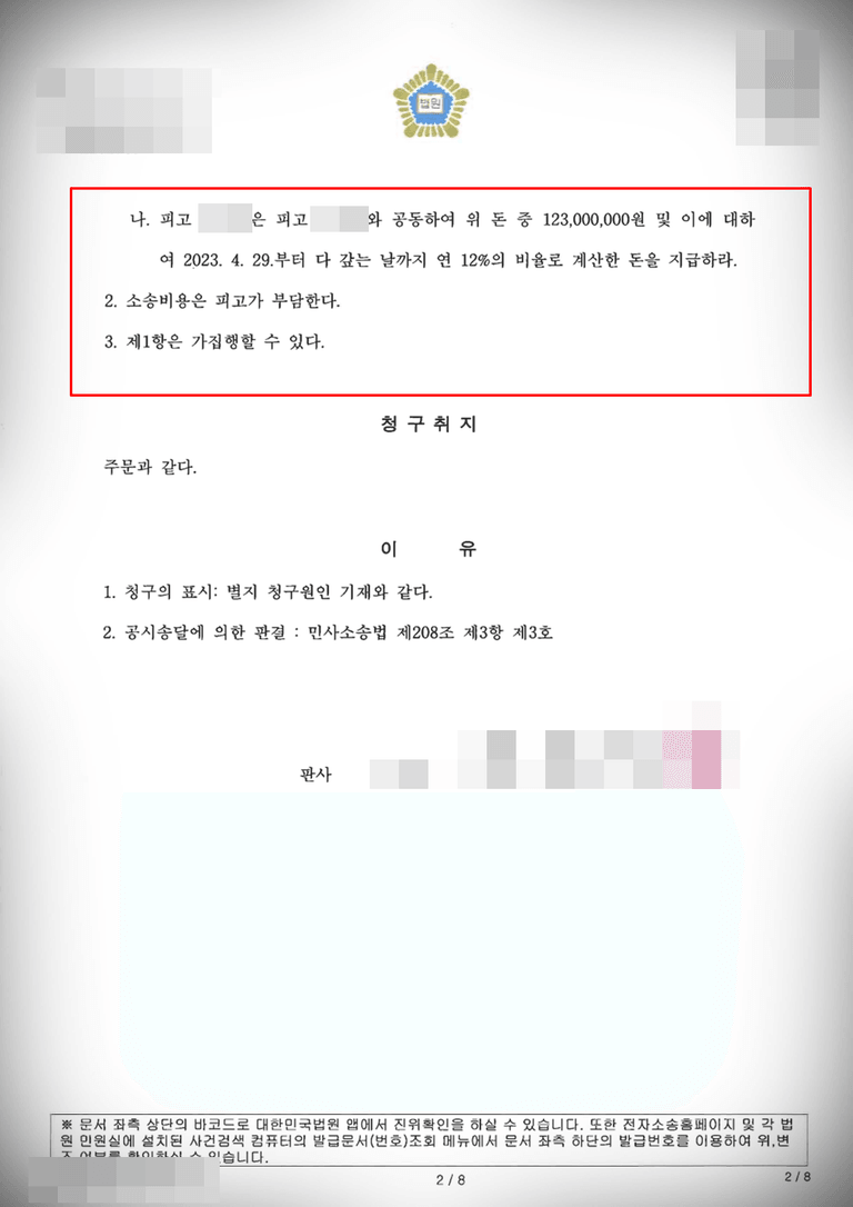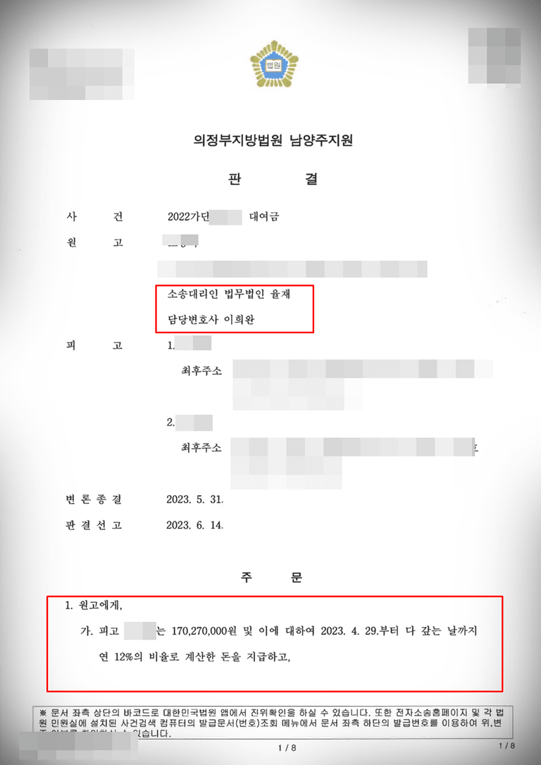 저희 율재는 본 사건에서 선고 받은 전부 승소만으로 마무리하지 않고 의뢰인께서 실제로 받지 못한 대여금 전부를 회수하실 수 있도록 모든 법적 수단을 동원하여 조력하였습니다.