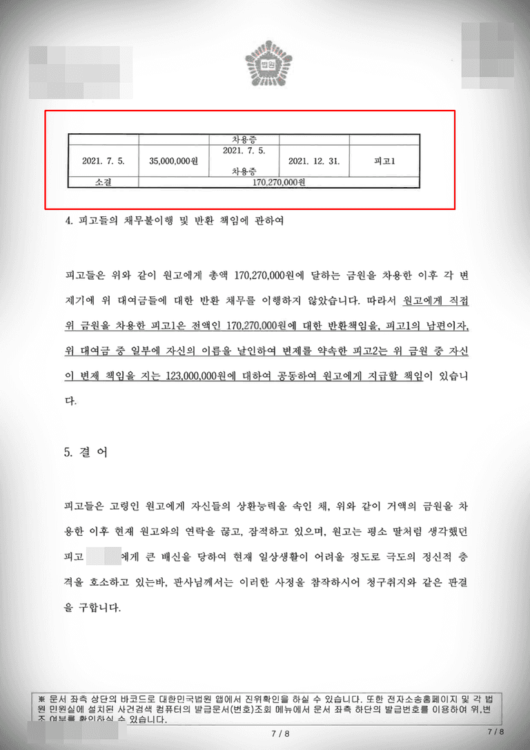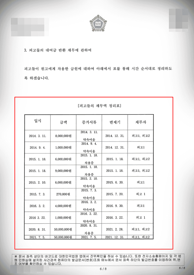 그렇게 9년 동안 피고가 의뢰인으로부터 빌린 금전은 1억7천여만 원에 달하였지만 피고와 그녀의 배우자는 단 한 번도 채무를 변제하지 않았으며 의뢰인의 연락을 받지 않고 잠적까지 하였습니다.