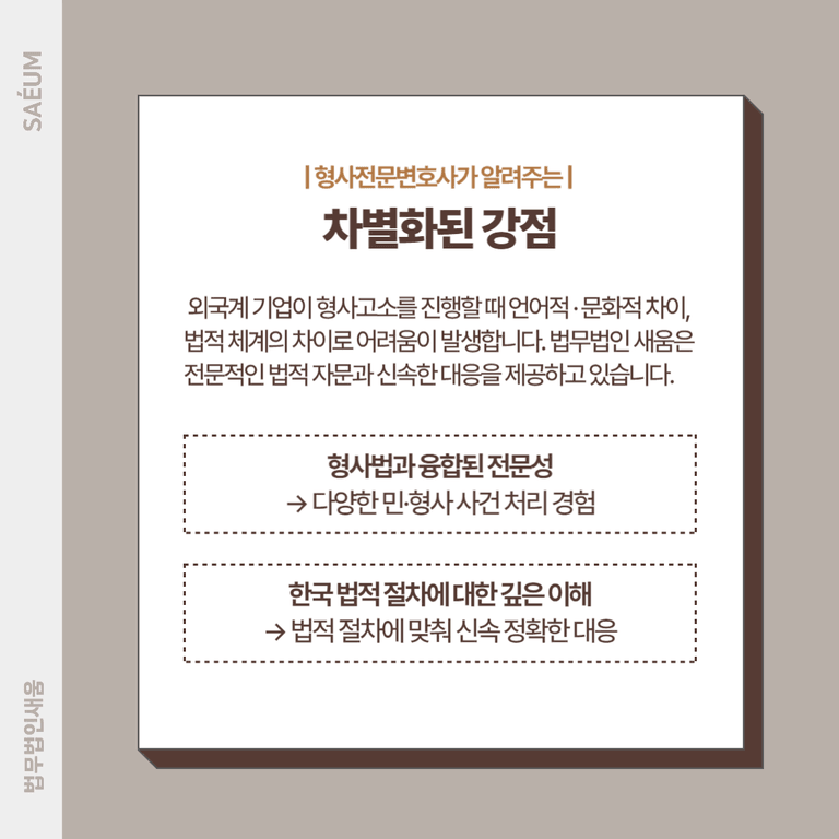 법무법인 새움은 이번 형사 고소 사건에서 한국 법 체계를 완벽히 이해하고, 외국 기업이 한국 내에서 발생한 문제에 효과적으로 대응할 수 있도록 지원하는 차별화된 강점을 보유하고 있습니다. 외국 기업이 한국 내에서 형사 고소를 진행할 때는 언어적·문화적 차이뿐만 아니라 법적 체계의 차이로 인해 어려움이 발생할 수 있습니다. 법무법인 새움은 이러한 문제를 해결하기 위해 전문적인 법적 자문과 신속한 대응을 제공하고 있습니다.