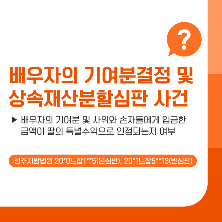 부친 사망 이후 2명의 딸들은 부친으로부터 돈을 받을 때 자신의 남편과 자녀들의 계좌로 받은 것을 근거로 자신들은 부친으로부터 받은 돈이 거의 없다고 주장하면서 부친 명의로 남아 있는 상속재산에서 자신들이 더 많이 분할받아야 한다고 주장하면서 상속재산분할심판청구를 하였고, 상대방인 배우자는 반대청구로서 기여분청구를 한 사건입니다.