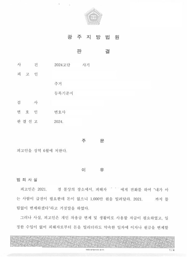 저는 즉각 차용금사기로 형사고소 하였고 법원은 실형을 선고하여 의뢰인은 대여금을 변제받았습니다(실형 선고 후 합의하였습니다).