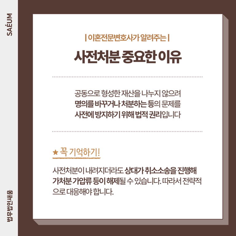 물론 사전처분이 쉽게 내려오는 것은 아닙니다. 이는 상대방의 재산권 행사를 강제적으로 제한하는 것이기 때문에 법원에서 신중하게 고려하여 판단을 내립니다. 또한, 사전처분이 받아들여지더라도 상대방이 취소소송을 진행해 애써 설정한 가처분, 가압류 등이 해제될 수 있습니다. 따라서 충분한 준비 과정을 거치고 문제 발생 시 즉각적으로 대응하여 상황이 복잡해지는 것을 막을 수 있어야 합니다.