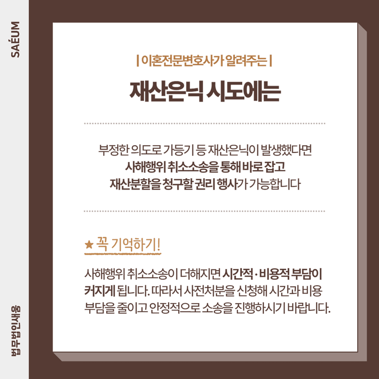 부정한 의도로 은늑하는 상황이 이미 발생했다면, 사해행위취소소송을 통해 바로잡고 다시금 재산분할에 대한 권리 행사가 가능합니다. 다만 사해행위취소소송이 더해지면서 시간적, 비용적 부담이 커지며, 관계를 깔끔하게 정리하기까지 많은 시일이 소요될 수 있습니다. 따라서 상대방이 수상한 움직임을 보인다면 선제적으로 사전 처분을 신청해 시간과 비용의 부담을 줄이고, 안정적인 상황에서 재산분할을 논의하거나 소송을 진행하는 것이 좋습니다.