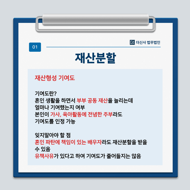 아무리 주부로서 가사 일에 전념하였더라도 부부 공동으로 재산 형성 및 증식에 기여하였다면 재산분할의 기여도를 주장할 수 있습니다.