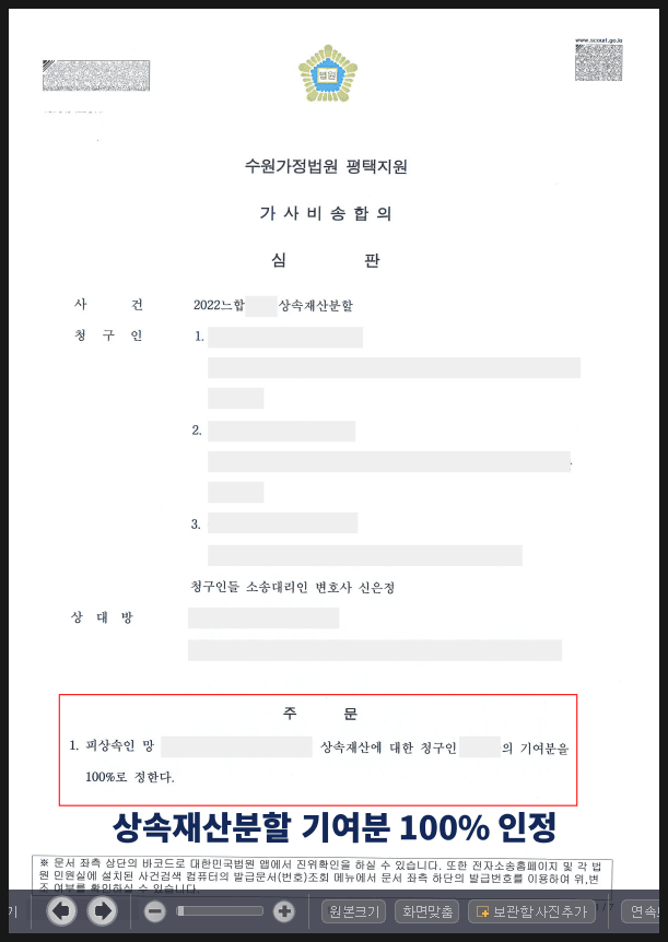 저희 기여분 100%를 인정받아 상속재산 전부를 받은 사례가 있습니다.