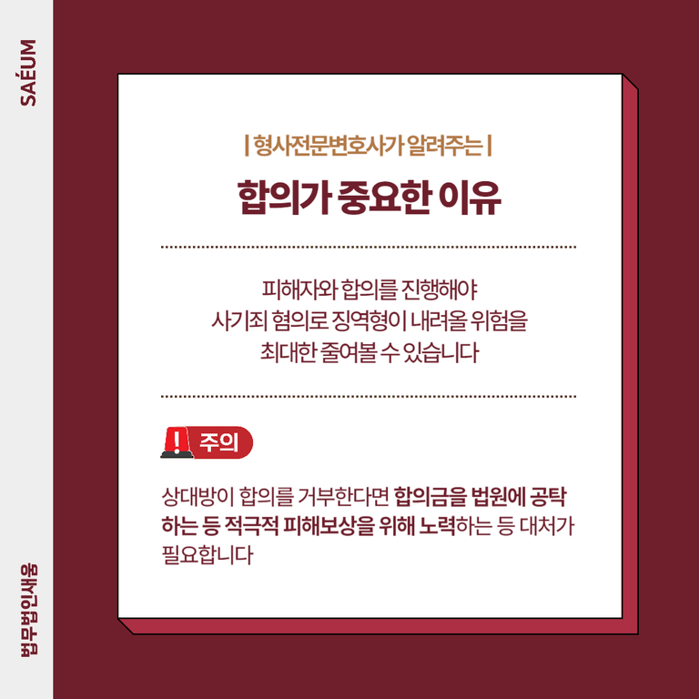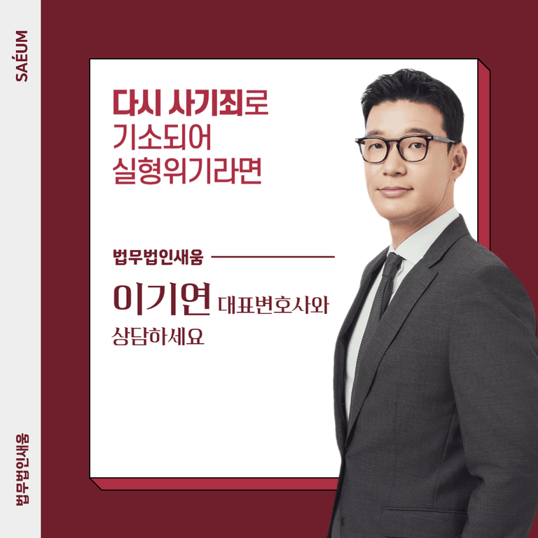 이렇게 법무법인 새움의 형사전문변호사는 일정 부분의 피해복구를 돕고 사기죄 합의를 마쳤으며 적극적인 기망행위를 하지 않았음을 강조하여 선처를 유도하였습니다. 그 결과 재판부에서는 법무법인 새움의 주장하는 바를 참작하여 사기 재범이었음에도 집행유예를 선고하였습니다.