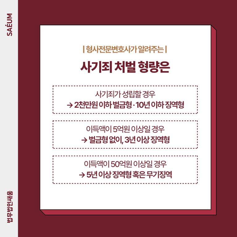 타인을 속여 이득을 취하고 상대방에게 피해를 입히는 경우 사기죄가 성립되며, 사기 징역형 10년 이하 혹은 벌금형 2천만 원 이하 처벌이 내려오게 됩니다. 이때 이득액에 따라서 처벌 규정이 달라지는데, 5억 이상부터는 특경법 적용으로 3년 이상의 사기 징역형이 선고되며, 50억 이상은 5년 이상의 징역 혹은 무기징역이 선고될 수 있습니다.