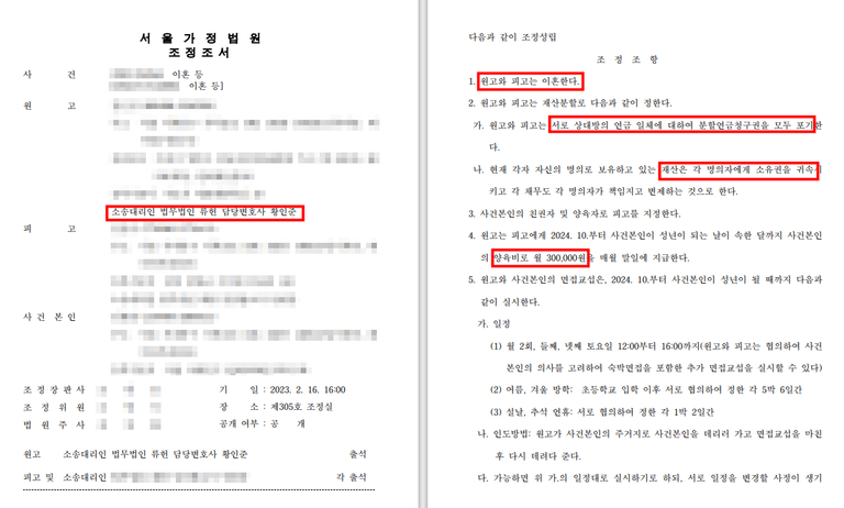 상대방의 유책으로 인해 혼인이 파탄 났다는 것을 입증하기 위하여 의뢰인의 병원 진단서, 평소 상대방이 의뢰인을 무시하고 모욕했던 대화 내역 등을 제출하여 상대방에게 전적인 유책이 있음을 서면으로서 입증 주장하였습니다. 사실상 의뢰인과 상대방의 의견 및 입장이 대립하는 상황이었던 터라 조정이 거의 불가능한 상태였으나 조정을 성립하도록 조력하여 의뢰인이 원하는 방향으로 본 사건을 종결하였습니다.