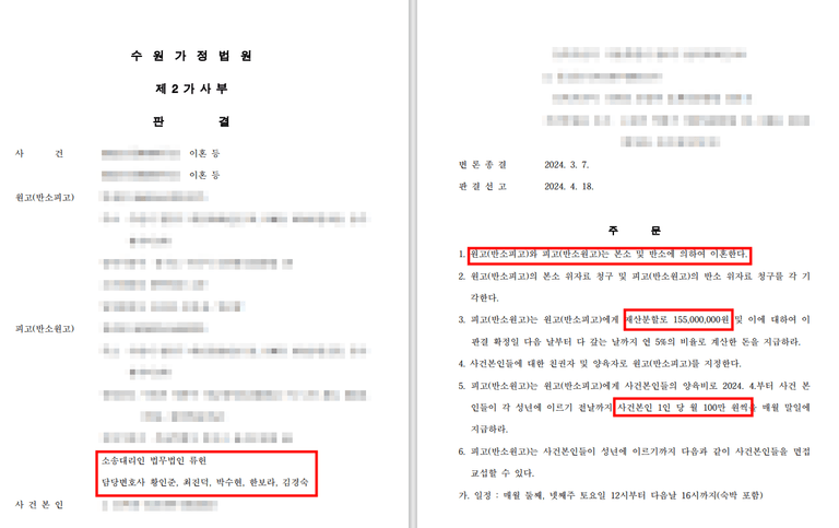 대리인은 각종 증거신청을 통하여 아내 명의의 재산을 샅샅이 찾아내는 등 재산분할을 핵심으로 하여 사건을 진행하였고, 의뢰인의 대출금이 부부공동생활에 사용되었다는 점을 상세히 정리하여 재판부에 제출하였습니다.