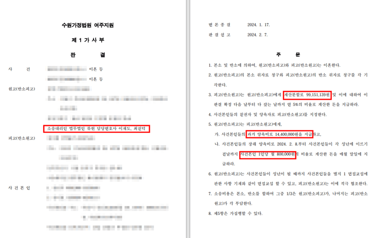 대리인은 각종 증거신청을 통하여 아내 명의의 재산을 샅샅이 찾아내는 등 재산분할을 핵심으로 하여 사건을 진행하였습니다.
