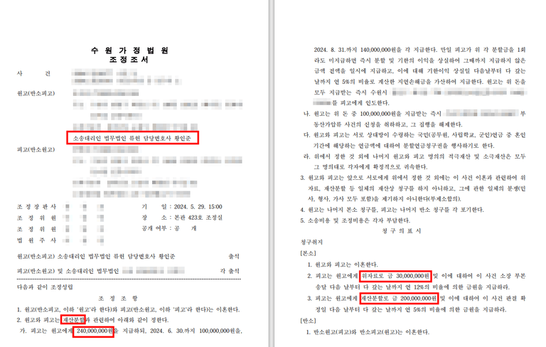 의뢰인은 상대방의 재산을 제대로 파악하지 못하는 상황이었지만, 의뢰인의 재산 역시 상대방이 자세하게 모르는 상황에서 조정으로 빨리 사건을 종결하길 원하였습니다. 이 사건은, 의뢰인이 원하는 조건인 연금에 대한 청구권을 지켜내면서 상대방이 의뢰인에게 현금으로 재산분할금을 지급하는 결과를 얻어냄과 동시에, 의뢰인의 바람대로 변론기일 1회 진행 후 조정기일에 바로 조정을 성립하여 빠르게 종결한 사례입니다.
