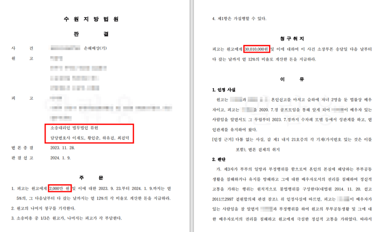 대리인은 상간 사실은 인정하지만, 3천만 원의 위자료는 과하다는 근거를 수집·제출하고 위자료의 감액을 구하는 서면을 재판부에 제출하였습니다.