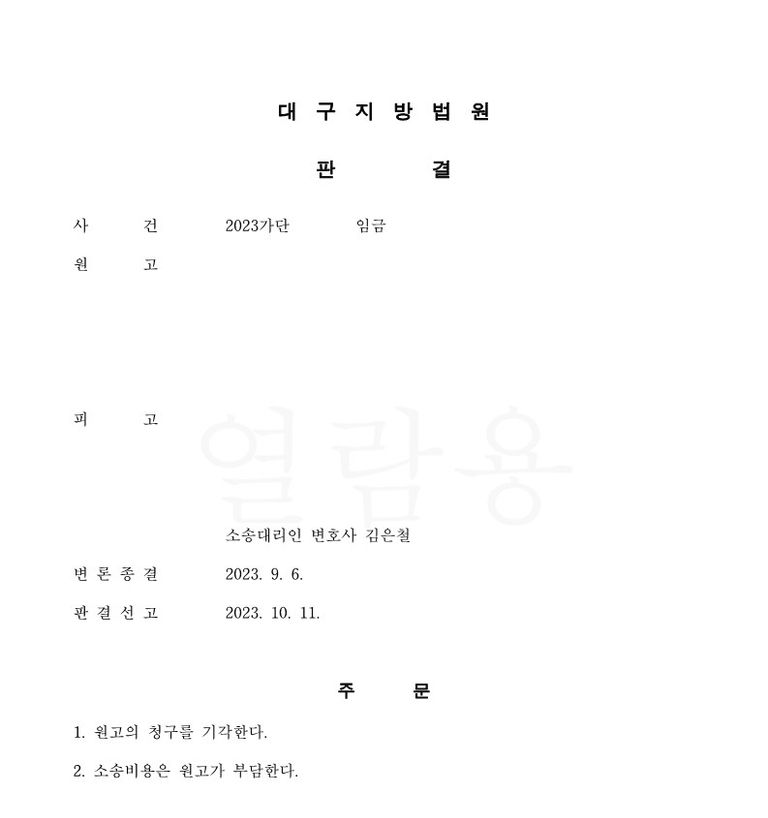법원은 피고회사 소송대리인의 주장을 받아들여 원고의 피고회사에 대한 청구를 기각하는 판결을 선고 하였습니다.