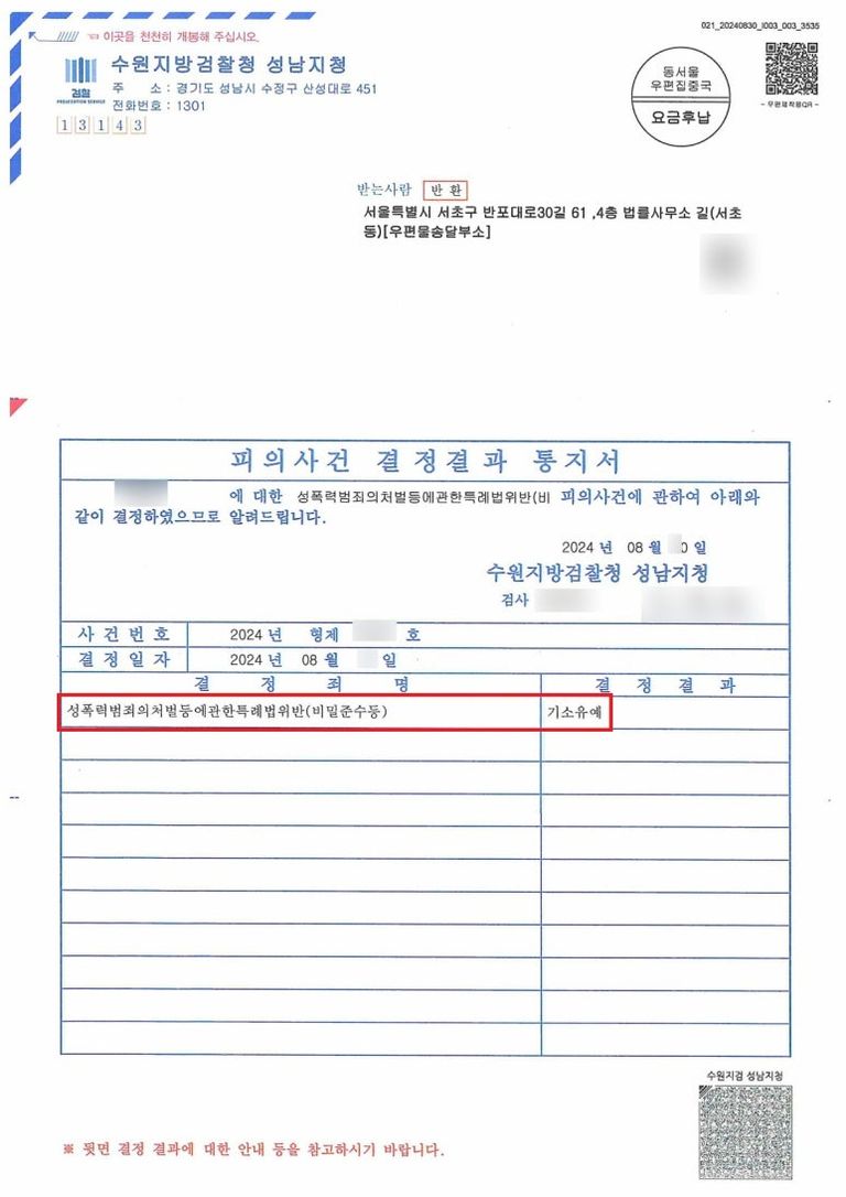 그래서 저는 변호인 의견서를 통해 법률의 규정상 이 사안의 경우 신상정보등록 위반에 해당하지 않아 처벌할 수 없다는 취지의 의견서를 제출하면서, 설령 신상정보등록 위반에 해당하더라도 참작할 사유가 있으므로 '기소유예' 처분을 해달라는 주장을 하였습니다.사건을 담당한 검사의 제 변호인 의견서의 내용을 수용하여 '기소유예' 처분을 하였고, 의뢰인도 '기소유예' 처분에 대해 만족하였습니다.