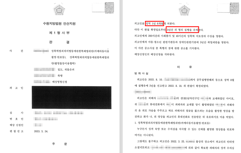 상대방은 해당 영상을 sns를 통해 유포한 것으로도 모자라, 의뢰인이 이 사건 고소를 한 후 영상을 추가로 유포하겠다는 협박을 하여 고소 취하를 종용하였고, 다른 범죄행위로 인한 사건 또한 병합되어 함께 재판이 진행되었습니다.