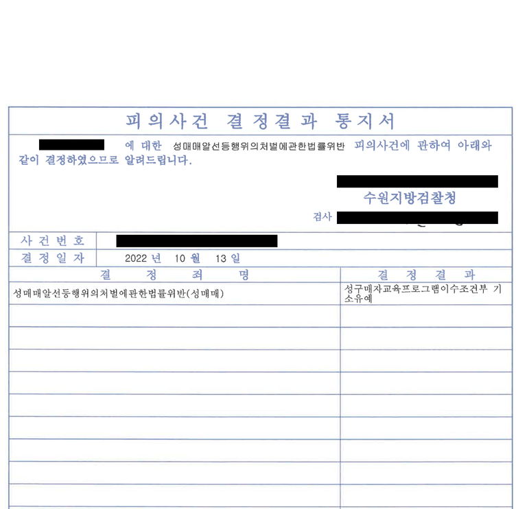 본 변호인은 인식가능성을 다소 낮추는 취지의 변론과 더불어 기타 양형요건인 재범방지를 위한 노력, 피해자에 대한 피해회복 등을 넉넉히 준비시킨 뒤 최종 검사 면담을 통해 의뢰인이 그간 사회에 헌신한 바가 적지 않음을 피력하며 불기소처분을 고려해줄 것을 요청하였고, 그 결과 의뢰인께서는 성구매자교육프로그램을 이수하는 것을 조건으로 하는 기소유예처분을 받고 형사재판을 받는 일 없이 가정으로 돌아갈 수 있었습니다.