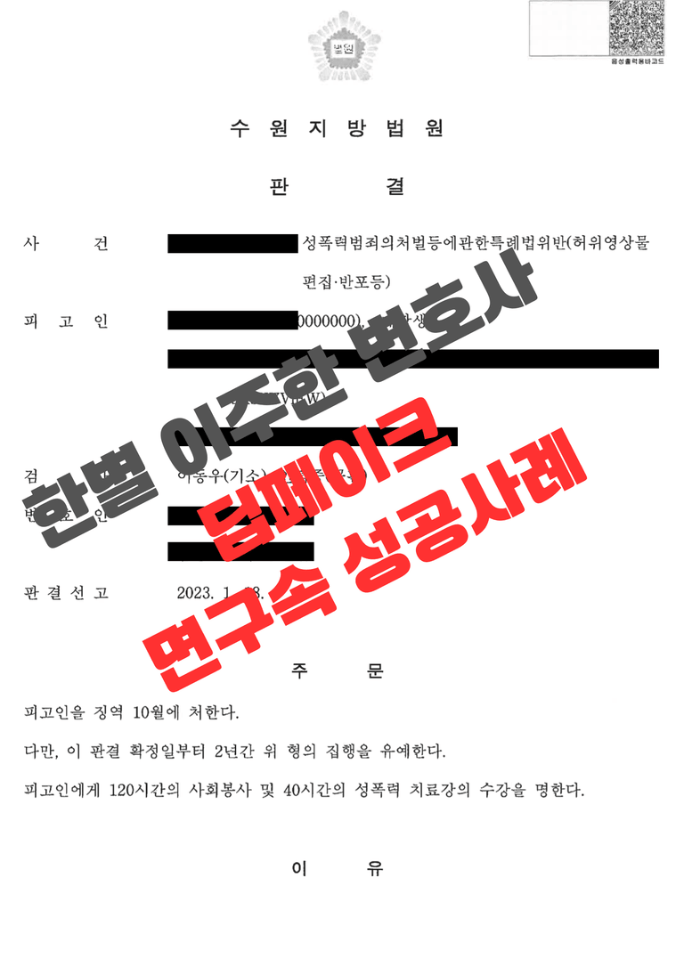 그 결과, 의뢰인은 최초 상당한 양의 딥페이크 범죄 증거물에도 불구하고 집행유예를 선고받아 선처로 사안을 마무리 하였습니다.