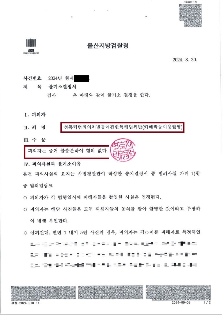카메라등이용촬영죄의 기본적인 성립요건 중 하나는 '피촬영자의 동의나 승낙 등이 없을 것'인데, 이 부분에 대한 집중적인 변론 내용을 담은 변호인의견서를 제출하여 다시금 변론 내용을 보강.강화하였고, 그 결과 담당검사님은 이 사건을 무혐의(증거불충분) 처분하게 되었습니다.