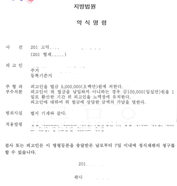 검사의 약식기소가 있으면 법원은 유죄로 인정될 경우 피고인을 벌금을 선고하는 약식명령을 내리고, 이 때 사건번호는 @@지방법원 202@고약@@@ 으로 표시됩니다.