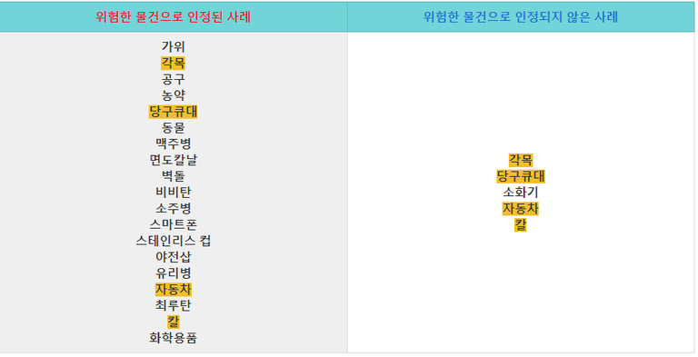 결국 위험한 물건인지 여부는 섣불리 단정할 수 없는 것입니다. 그러나 어떤 것들이 위험한 물건으로 인정되었는지에 관한 대략적인 느낌을 아는 것은 의미가 있을 것입니다. 아래 표를 보면 중복되는 항목들이 보이는데, 그것은 그 당시의 구체적인 상황과 물건을 사용한 방법에 따라 피해자가 위험성을 느꼈다고 볼 수 있는지가 달라진 것이라고 보면 됩니다.