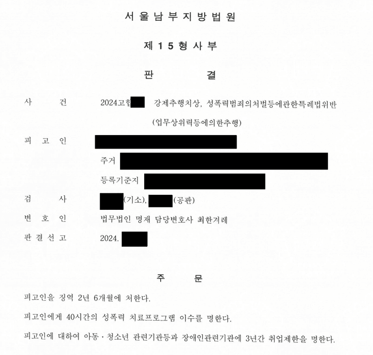 징역 2년 6개월, 40시간 성폭력 치료프로그램 이수명령, 아동, 청소년 관련기관등과 장애인관련기관 3년 취업제한 명령.