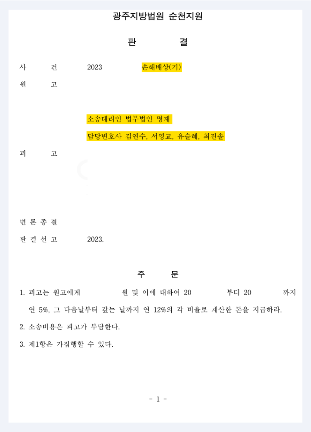 김연수 변호사의 빠른 판단으로 의뢰인은 피해 금액에 대하여 손해배상을 받을 수 있었습니다.
