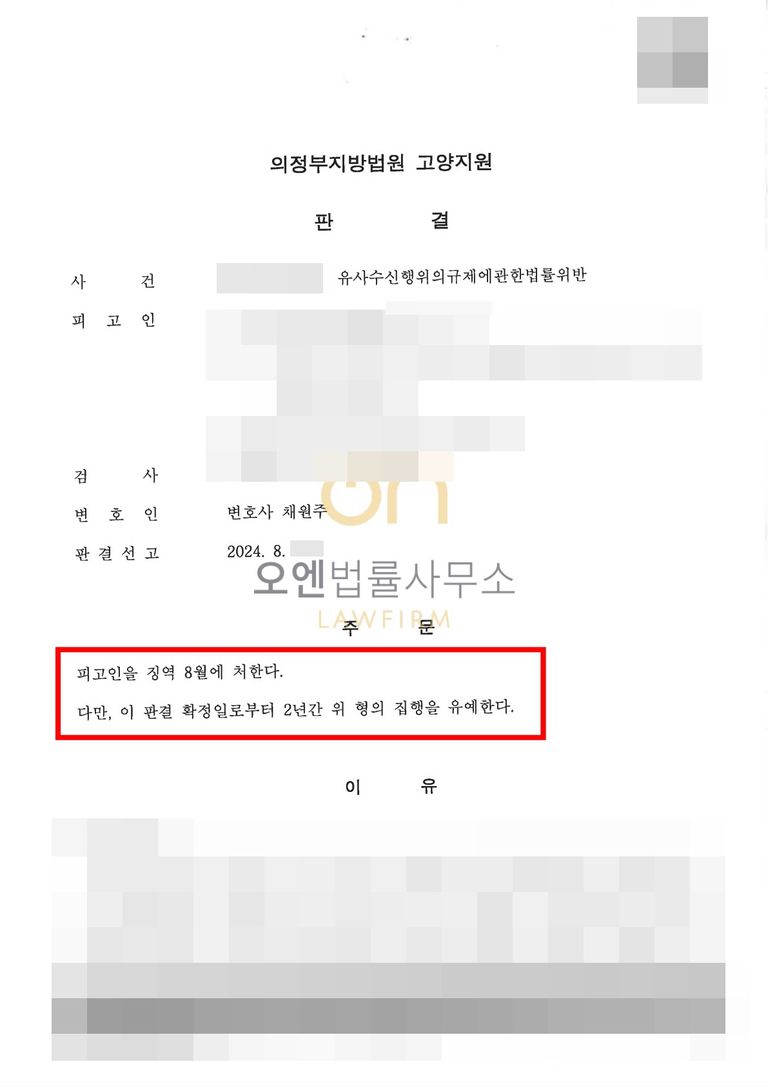 이민이 도주를 위한 것으로 의심받고 있었고, 의뢰인은 생업을 위해 출국이 시급하였기에 실형을 반드시 피해야만 했습니다. 비록 유사수신의 피해금액이 컸지만, 담당변호사는 결국 피해금을 의뢰인이 아닌 회사가 수령하였다는 점, 도주를 위한 이민이 아니었다는 점을 주장하면서 풍부한 양형사유를 주장하였습니다.
