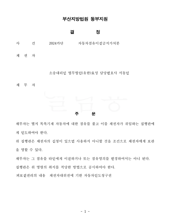 저는 즉각 피고를 상대로 자동차인도청구소송 및 자동차점유이전금지가처분을 제기하였고 법원은 가처분 인용 결정을 내려 의뢰인은 신속하게 자동차를 회수하였습니다.